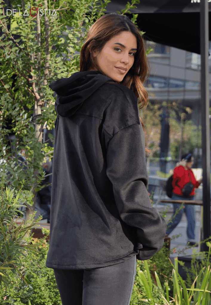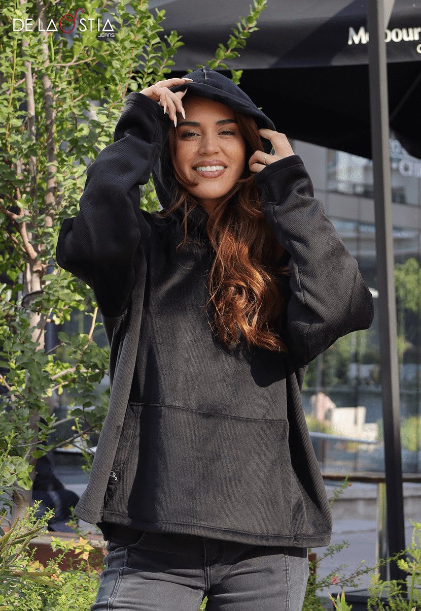 Hoodie Cotelé Aterciopelado – Tono Negro